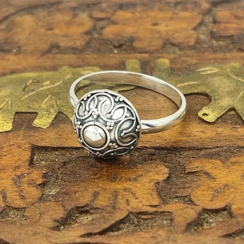 O anel tem aro em prata 925, que assegura resistência e acabamento duradouro. A técnica de filigrana envolve a criação de detalhes delicados e entrelaçados manualmente, conferindo exclusividade à joia. O acabamento é polido, realçando a beleza do metal.