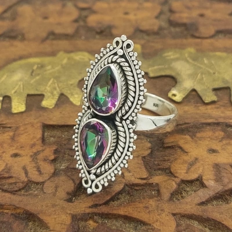 Anel artesanal feito em prata 925 com detalhes cuidadosamente trabalhados e duas pedras de topázio místico que destacam a peça.