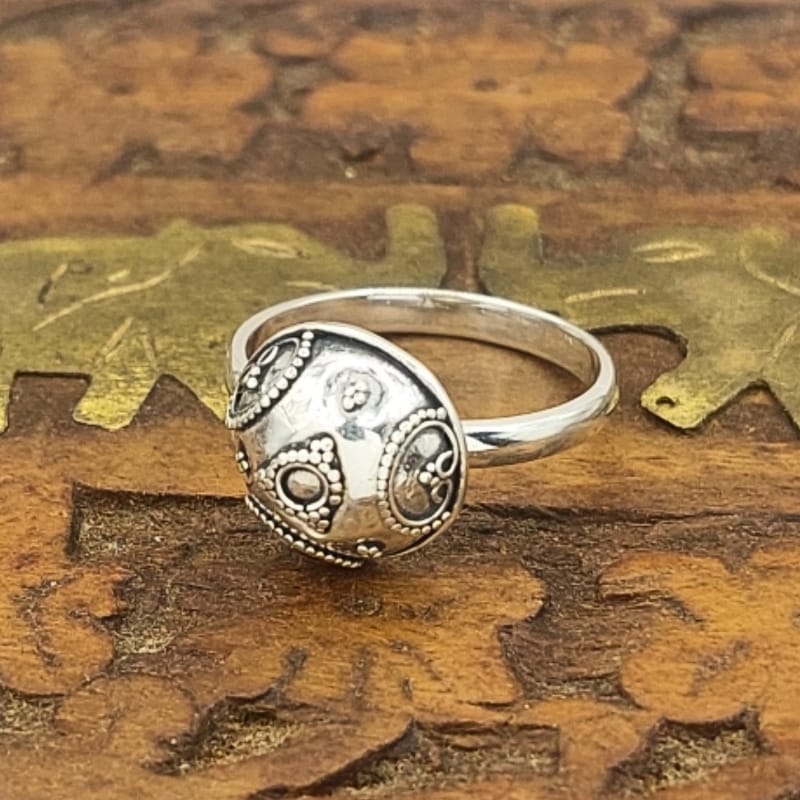O anel apresenta acabamento polido e detalhes em filigrana que realçam a beleza artesanal típica da prata balinesa. A peça é leve e confortável, adequada para o uso diário, combinando com diferentes estilos e ocasiões.