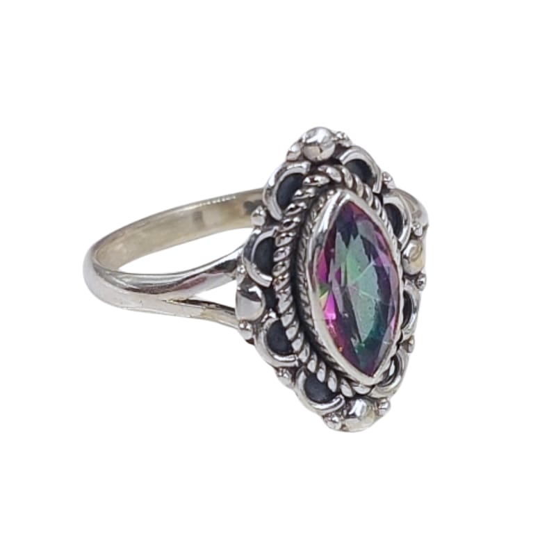Este anel de prata 925 indiana é uma verdadeira obra de arte. Feito à mão com muito cuidado e dedicação pelos artesãos indianos, ele apresenta um topázio místico natural que lhe confere um toque único e especial. Além disso, sua qualidade superior e garantia garantem que você possa desfrutar dele por muitos anos. Compre agora e adicione um toque elegante e sofisticado à sua coleção de joias.