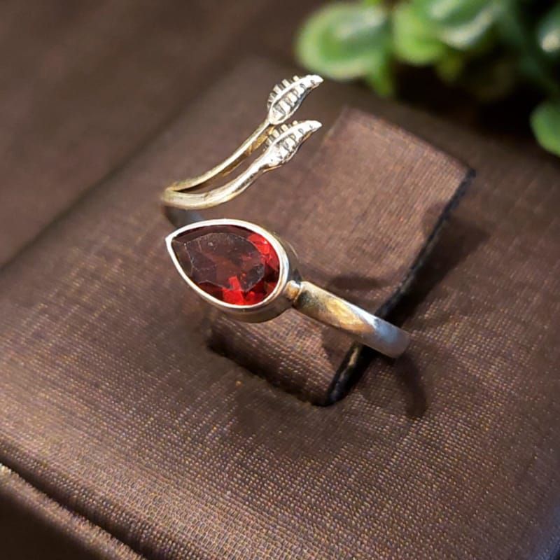 Este anel de prata 925 indiano artesanal é uma peça única e exclusiva que apresenta um design elegante e sofisticado. A granada lapidada adiciona um toque de cor a este anel,