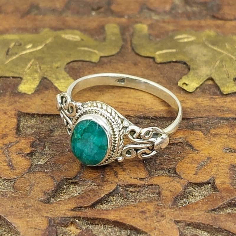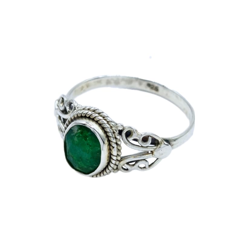 Este anel de prata indiana 925 com pedra natural Esmeralda é um verdadeiro tesouro. Totalmente artesanal, este anel apresenta um design exclusivo e uma pedra natural de alta qualidade. Importado diretamente da Índia, este anel é garantido para impressionar.